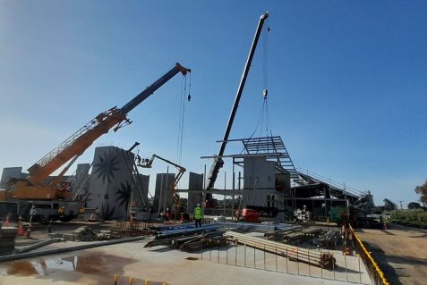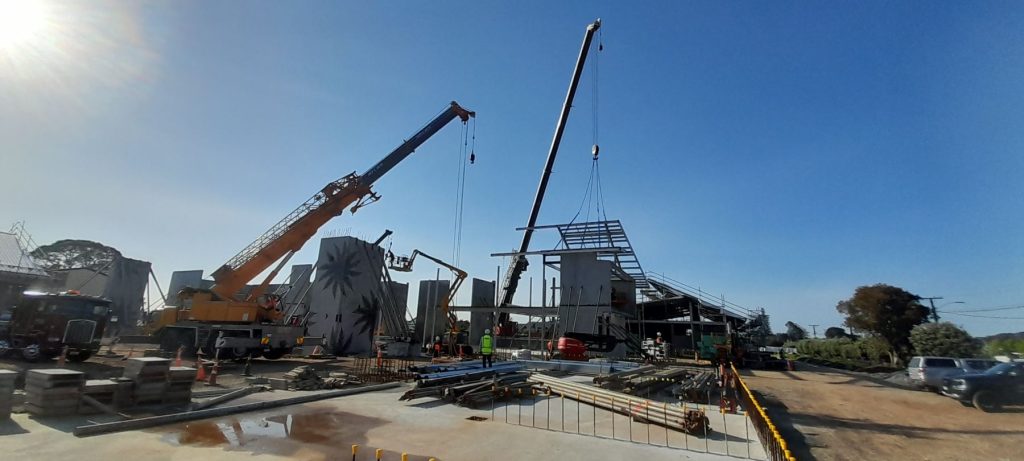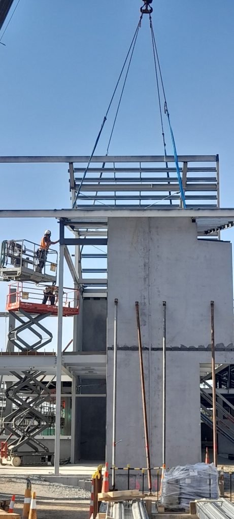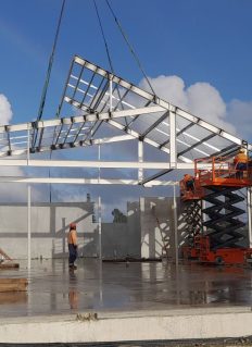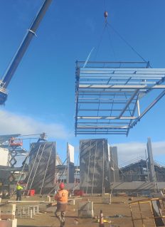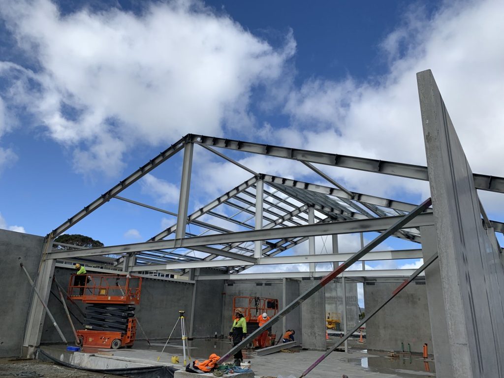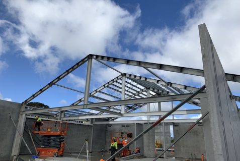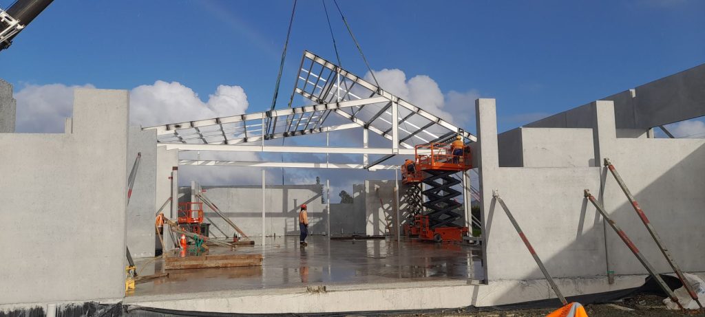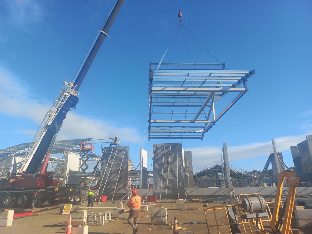 The project presented unique challenges due to the precast concrete walls being erected prior to our steel installation. This required precise placement of steelwork, most notably the 21m x 5.5m roof rafter frames, within the existing structure, leaving minimal tolerance for error. To address this, we assembled the large rafter frames in sections on site and welded them in situ. Through careful route planning and fabrication considerations, we were able to deliver complete frames to site as single-piece units, significantly reducing construction time.